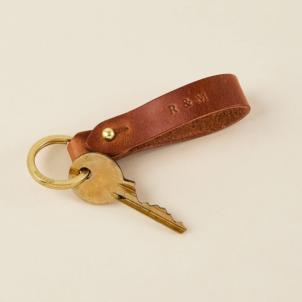 Simply made from one piece of British veg-tanned leather and solid brass fixings, the loop keyring is debossed on the front with your personalised text – either a name, initials or to label the key (up to 12 characters). The loop is secured with a brass stud and can be easily opened to attach to a bag or belt.